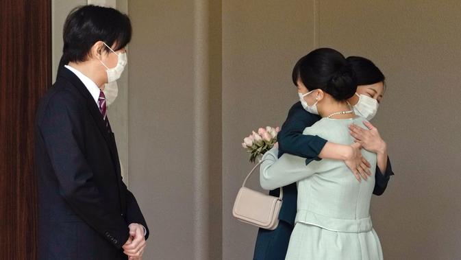 Putri Mako dari Jepang membungkuk di depan orang tuanya Putra Mahkota Akishino, Putri Mahkota Kiko dan saudaranya Putri Kako, sebelum meninggalkan rumahnya di Istana Akasaka, Tokyo, Selasa (26/10/2021). Putri Mako Putri Mako resmi menikahi teman kuliahnya, Kei Komuro (Koki Sengoku/Kyodo News via AP)